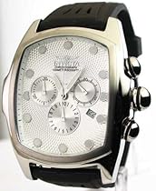 Lupah collection. Polished stainless steel tonneau case. Black genuine leather strap. White dial with silver luminous hands and hour markers. Scratch resistant mineral crystal. Water resistant to 100m. Precise Quartz movement. Case measures 29mm diameter by 10mm thick.